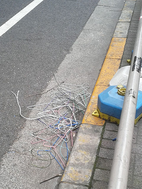 ある朝、幡ヶ谷駅前にハンガーが散乱しているのを見かけました。